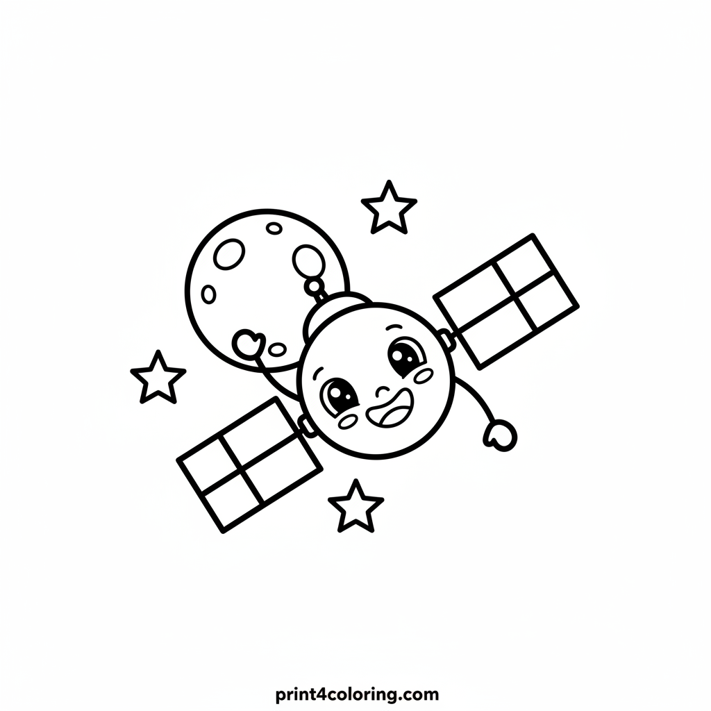 Blast off into fun with this adorable coloring page featuring a cheerful satellite! With big, happy eyes and a wide smile, our friendly space explorer waves hello with its solar panel arms. It floats gently near a simple, round moon, ready for you to add a splash of color to its cosmic journey. Perfect for little astronauts!