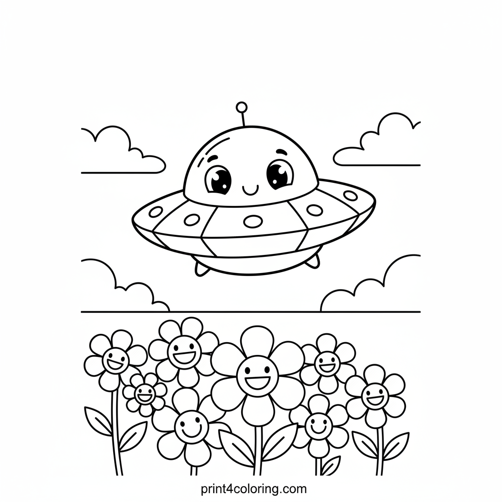 Get ready for an out-of-this-world coloring adventure! Meet our adorable, friendly flying saucer with big, happy eyes and a cheerful smile, gently hovering above a vibrant field of blooming flowers. Imagine all the bright colors you can use to bring this magical scene to life!