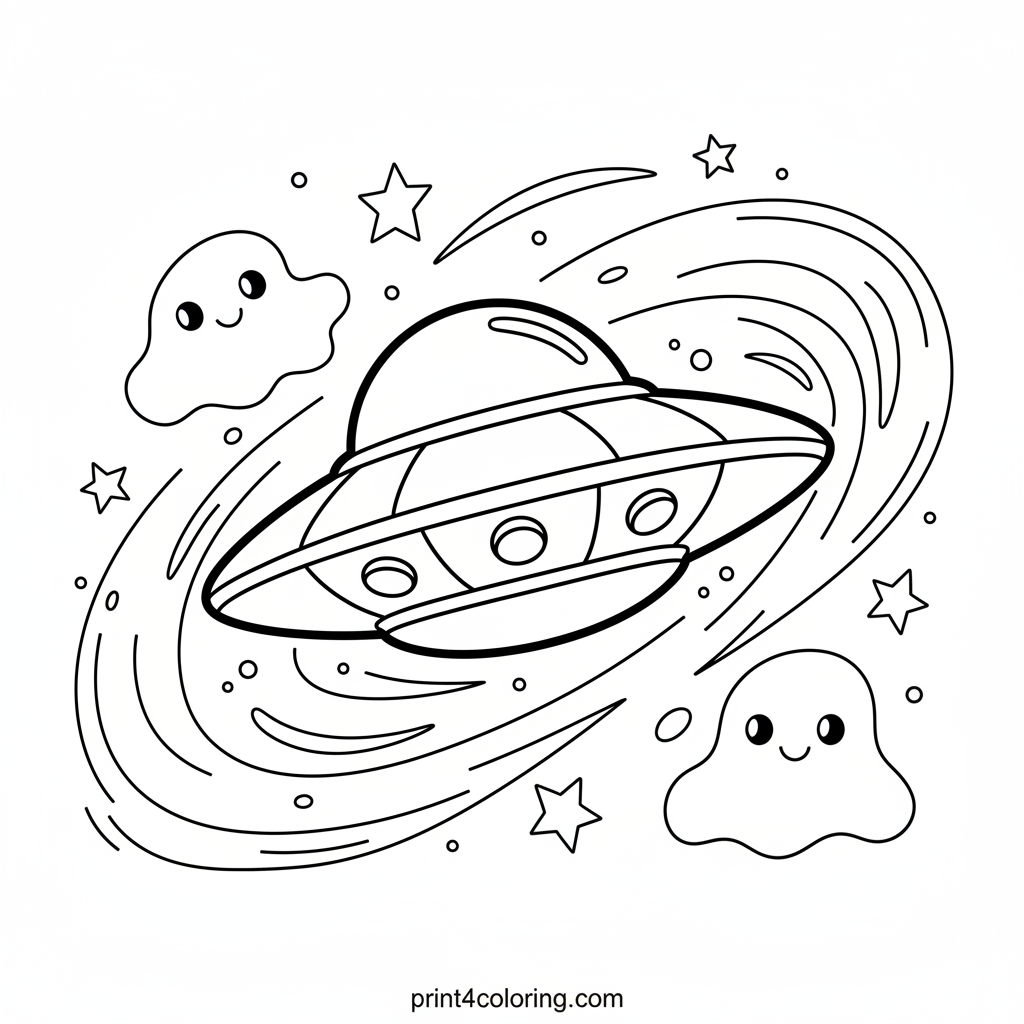 Embark on an easy, magical journey through the cosmos! This coloring page features a friendly, shiny UFO soaring past sparkling stars and vibrant swirling nebulae. Meet cute space dust creatures as you color this exciting scene, perfect for young space explorers to bring to life with bright colors.