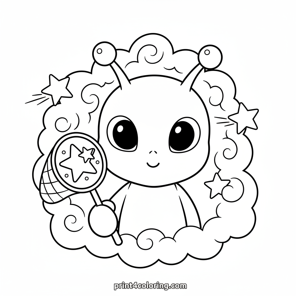 Meet our friendly alien, carefully reaching with glowing antennae to catch a twinkling star in a simple net. Swirling cosmic dust dances around this gentle space explorer. Imagine the vibrant colors you can use to bring this magical moment to life, creating a peaceful scene of wonder in the universe!