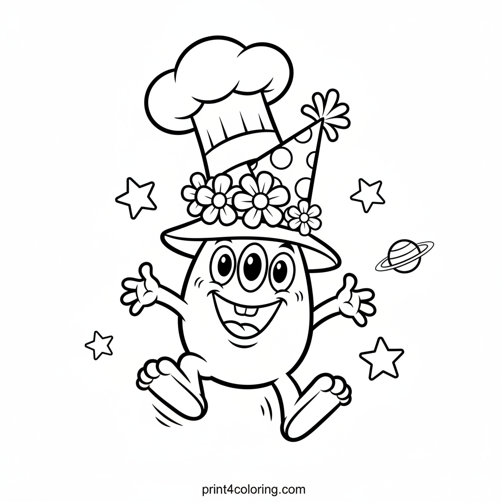 Join our friendly, three-eyed alien as they have a blast at their silly hat party! Watch them giggle with a big smile while trying on a towering stack of three hilarious, oversized hats: a chef hat, a party hat, and a flower hat. This playful scene is perfect for little artists to bring to life with vibrant colors!
