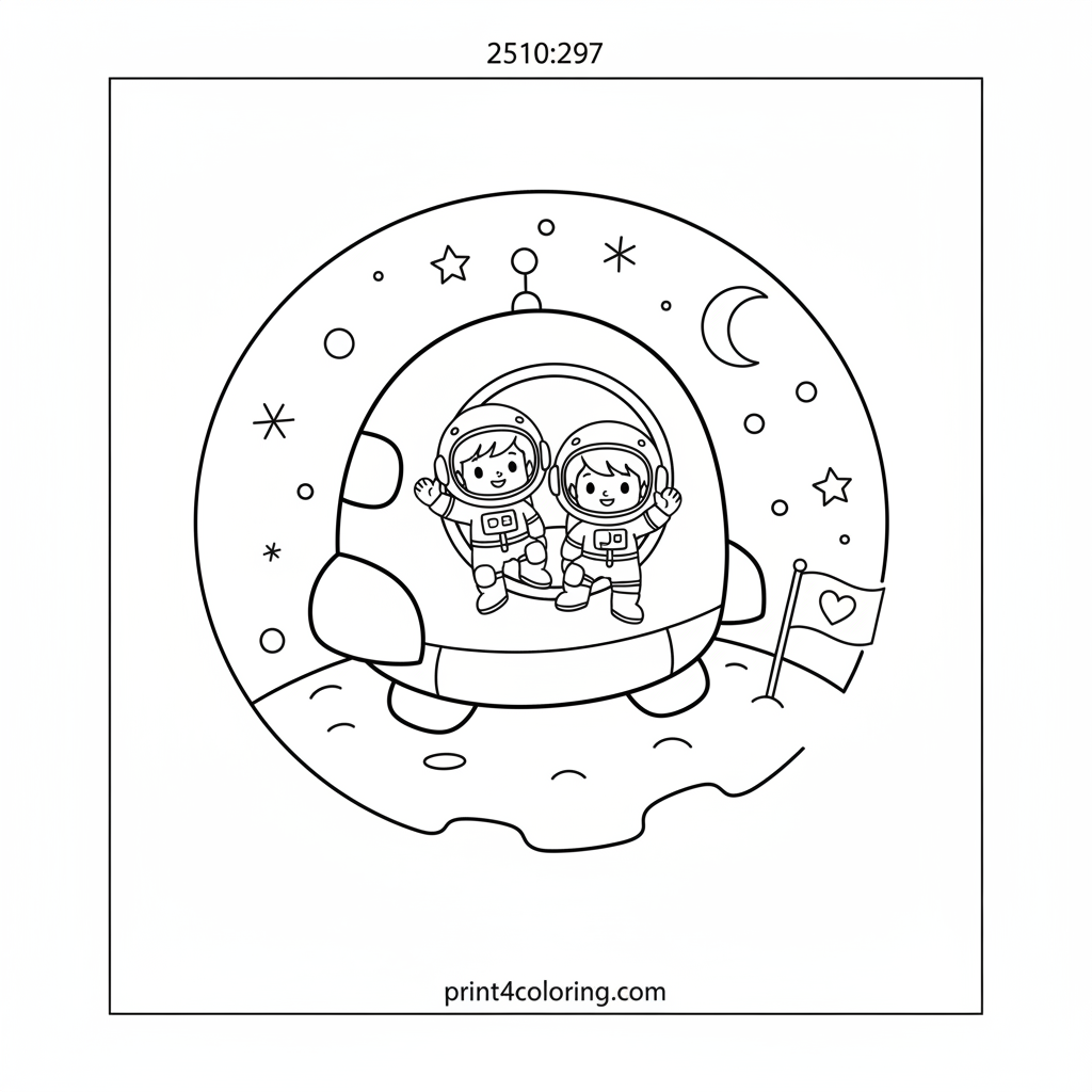 Join two cheerful little astronauts on an amazing moon adventure! Their cozy space shuttle has gently landed on a smooth, friendly moonscape. See them wave excitedly from the hatch and proudly plant a tiny flag. This delightful scene invites you to color their out-of-this-world exploration!