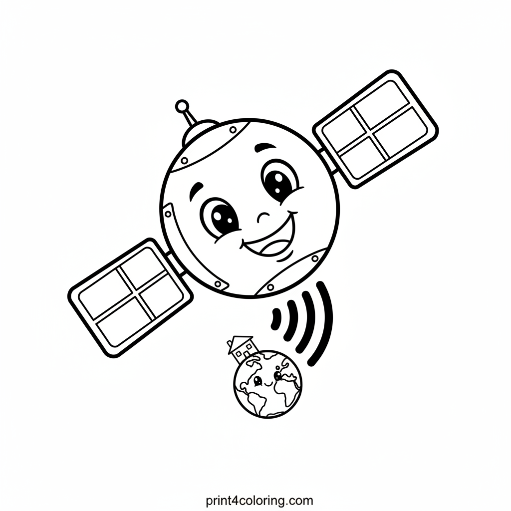 Blast off into a world of connection! This coloring page features a friendly satellite gracefully floating above a tiny, smiling planet Earth. Watch as it beams down cheerful, wavy signals to a cozy little house. A wonderful scene about how we stay connected across the globe with happy communication.