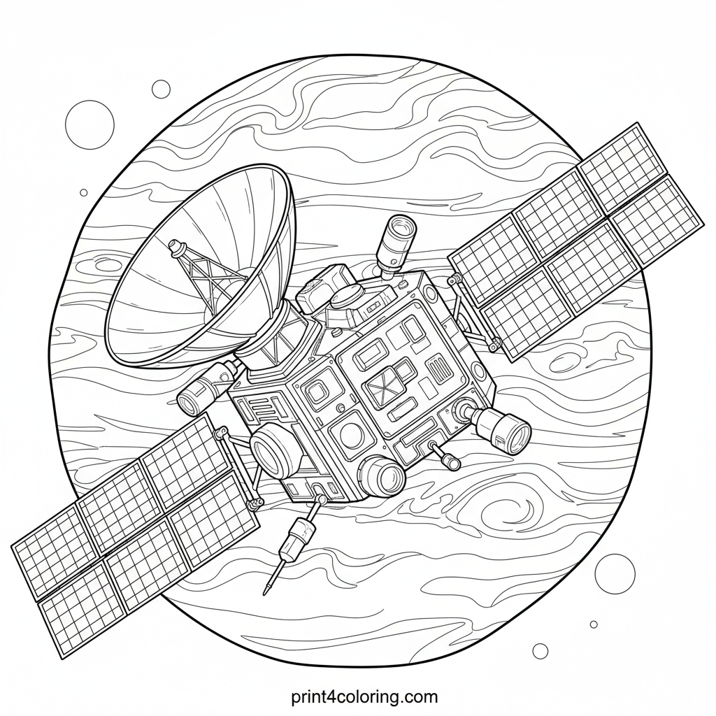 Embark on an epic space adventure! This coloring page features a friendly, detailed probe zooming past Jupiter's magnificent swirling clouds. Discover its scientific instruments and solar panels, with distant moons adding to the cosmic wonder. A stellar journey for budding astronomers!