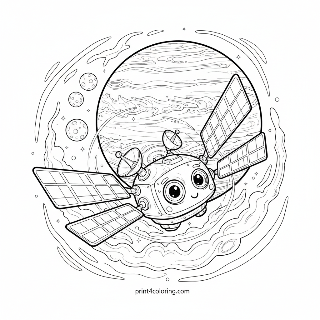 Embark on an expert coloring adventure with a friendly space probe as it gracefully navigates past Jupiter's magnificent swirling cloud bands. This detailed scene features visible scientific instruments, gleaming solar panels, and several distant moons, offering a captivating challenge for aspiring cosmic artists to bring to life.