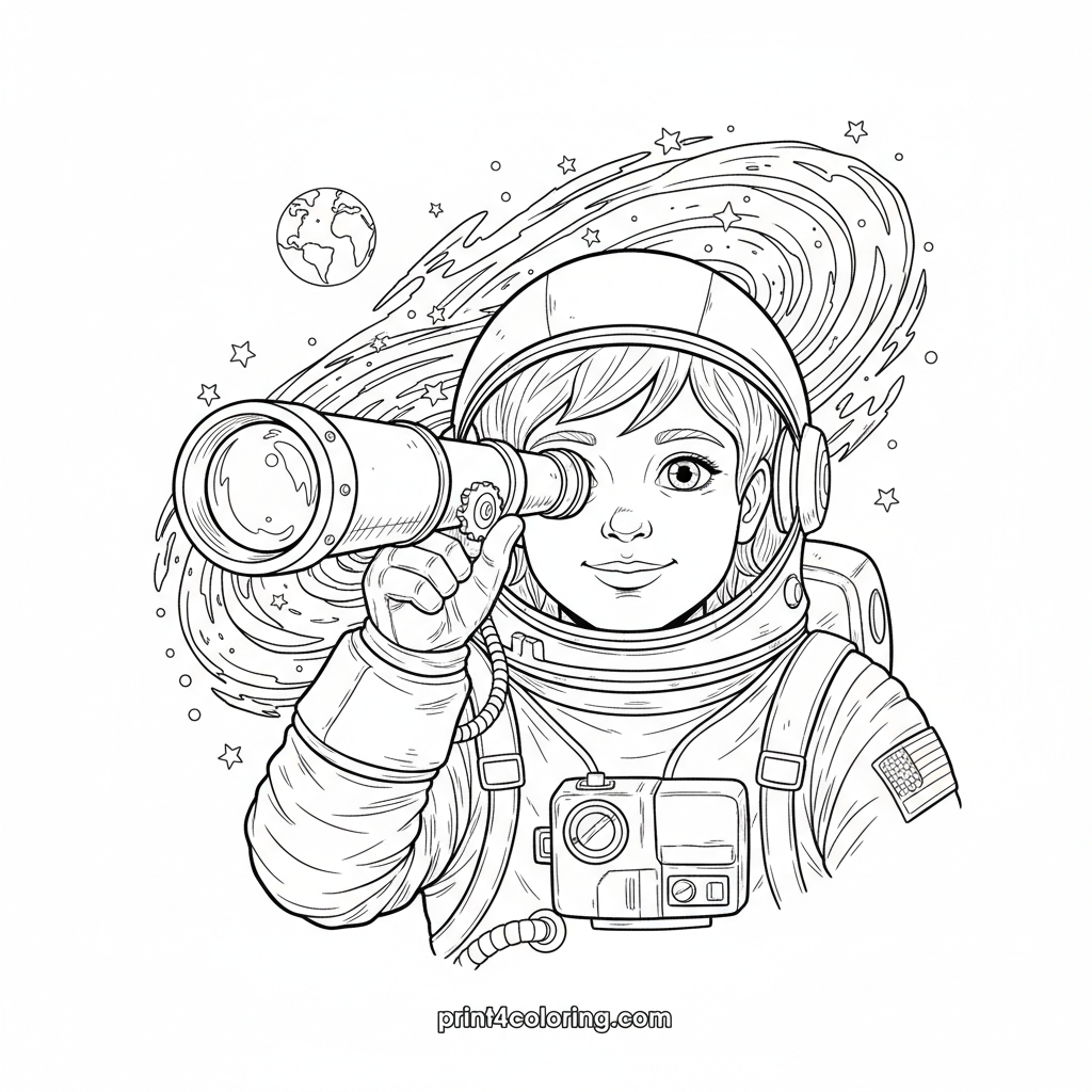 Join a curious young astronaut on the moon, peering through a powerful telescope! Discover distant galaxies swirling with stars and spot our beautiful Earth in the cosmic background. This detailed scene invites you to color a universe of wonder and imagination, perfect for aspiring space explorers.