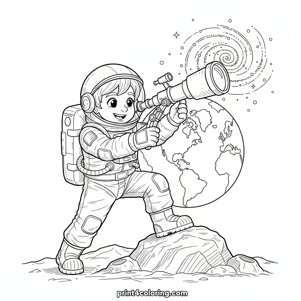 Embark on an interstellar adventure with a friendly young astronaut! Perched on a moon rock, our explorer peers through a powerful telescope, discovering a magnificent swirling galaxy. Earth shines softly in the distance, reminding us of home. A fantastic coloring challenge for aspiring space travelers!