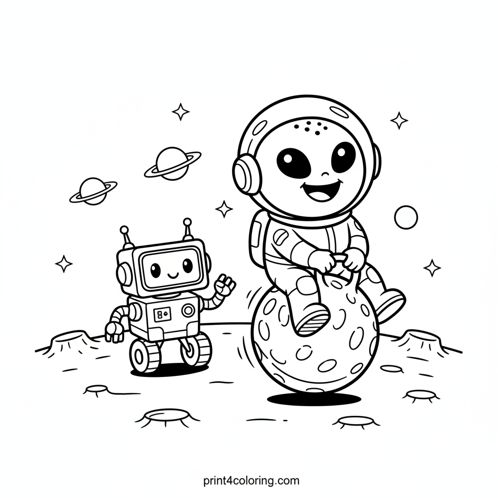 Get ready for an out-of-this-world adventure! A cheerful alien with a big smile is bouncing across the moon on a giant space hopper, racing a super-cool, friendly robot. Who will reach the finish line first in this epic lunar challenge? Grab your crayons and bring this cosmic competition to life!