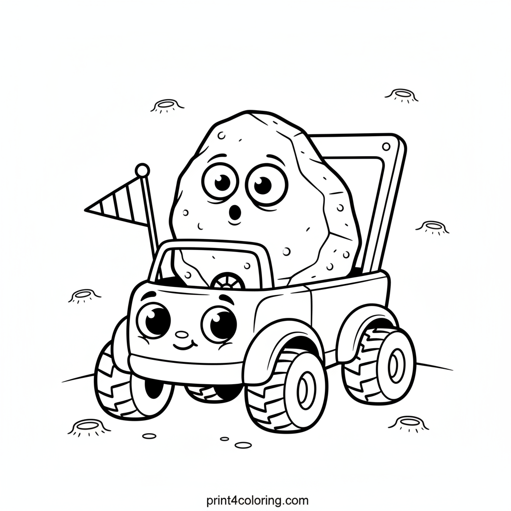 Join a funny moon buggy on its cosmic adventure! This close-up portrait shows our surprised little rover carefully transporting its very special pet rock, complete with big googly eyes. A tiny flag proudly waves from the back, adding to the charm of this out-of-this-world duo. Get ready to add vibrant colors to their space journey!