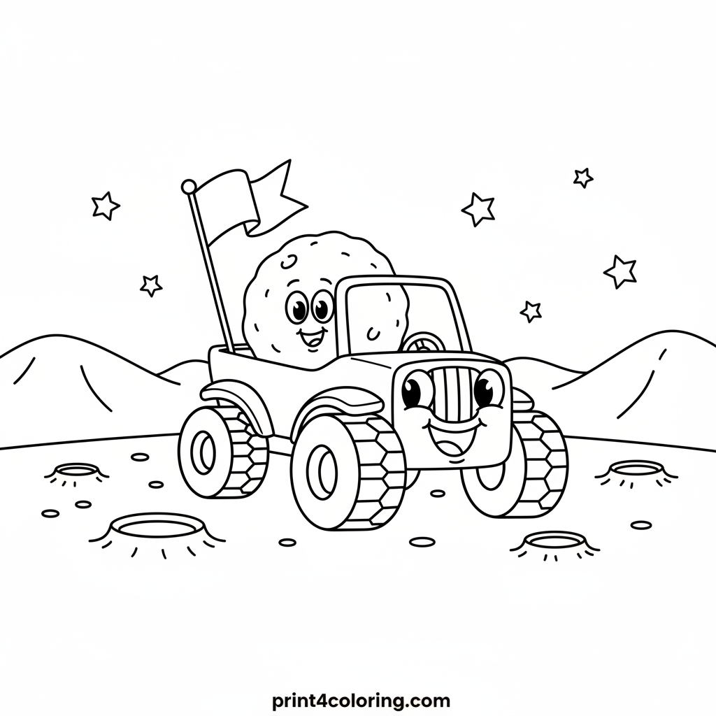 Blast off into fun with this moon buggy and its surprising pet rock! Our funny lunar rover, with a surprised face, carefully transports a giant, googly-eyed rock across the moon. A tiny flag waves, celebrating their unique space journey. Grab your crayons and color this out-of-this-world friendship!