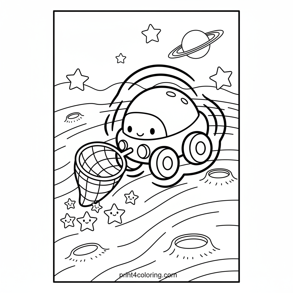 Join a magical moon buggy on an enchanting adventure! This whimsical vehicle, adorned with a special net, is gently collecting tiny, smiling stars from the shimmering lunar dust. Watch as the buggy glows softly, bringing a touch of magic to the quiet moonscape. Perfect for little explorers who dream of space and starlight.