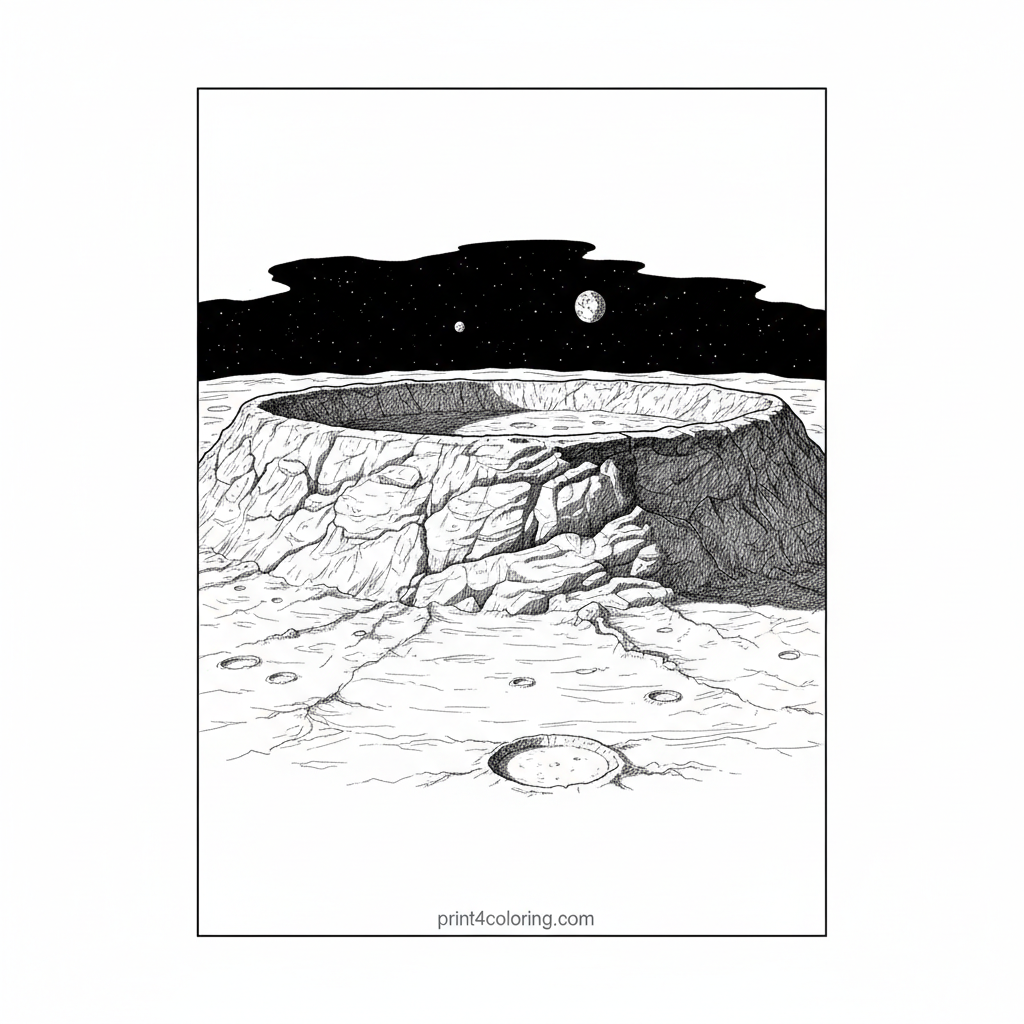 Embark on an expert coloring adventure to Mercury! This detailed scene showcases the planet's rugged, crater-filled surface with fascinating rock formations and deep shadows. Look closely to spot our tiny Earth and Moon far away in the star-studded background, reminding us of the immense wonders of space.