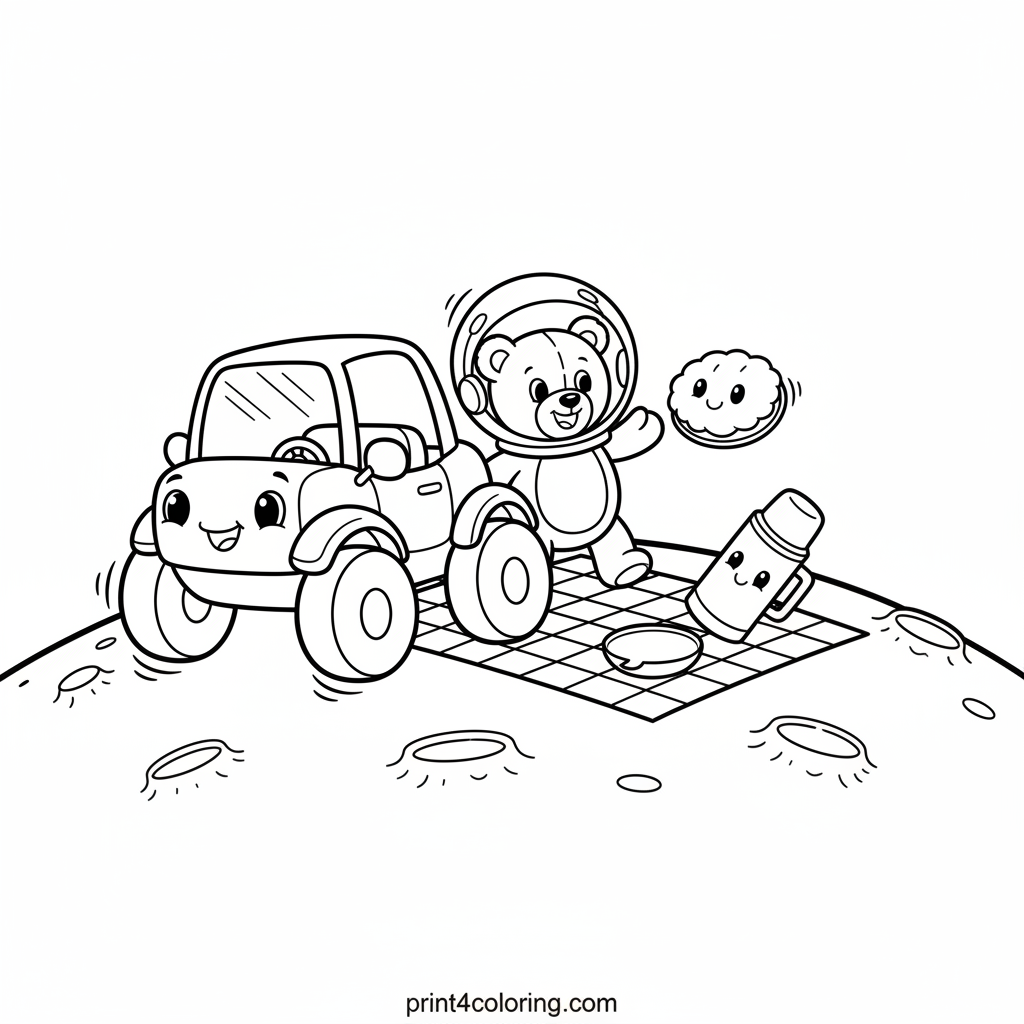 Zoom to the moon for an out-of-this-world picnic adventure! This fun coloring page shows a friendly moon buggy parked beside a cozy picnic blanket on the lunar surface. A cute space helmet-wearing teddy bear is enjoying a delicious 'moon-pie' from a thermos. Grab your crayons and add vibrant colors to this cosmic feast!