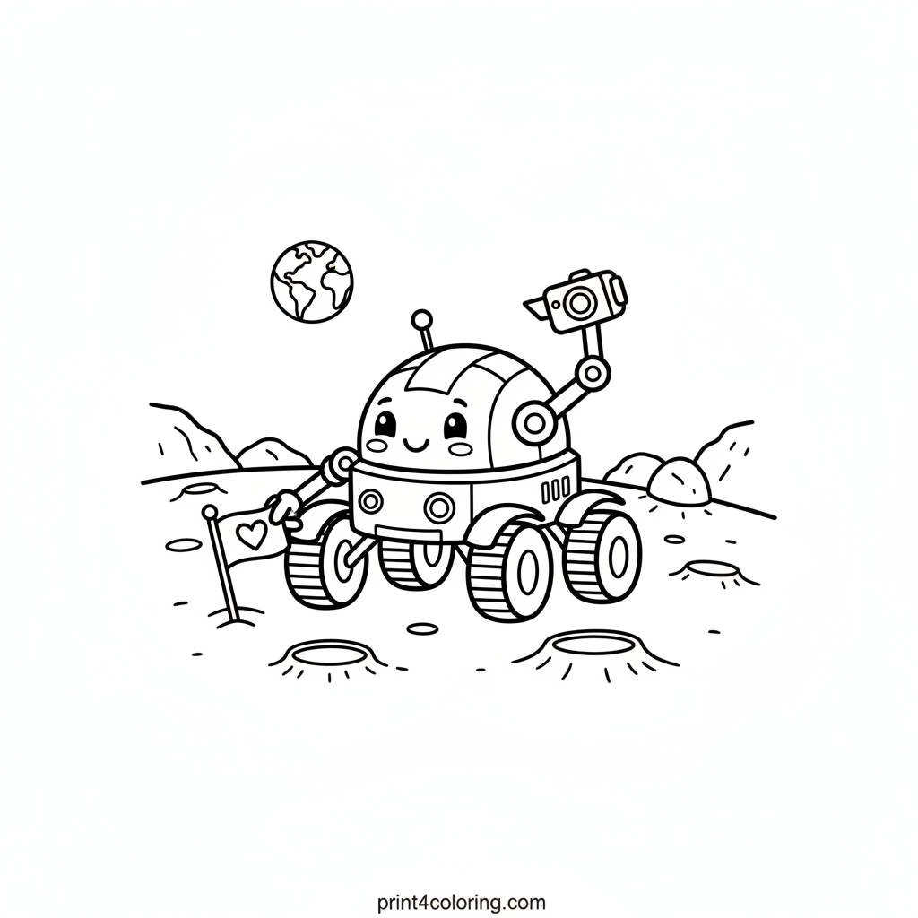 Our helpful lunar rover is on an important mission! Watch as it gently extends its robotic arm to plant a tiny, friendly flag into the moon's surface. Its small camera arm is ready to take a historic picture. Get ready to color this amazing scene of space exploration and discovery!