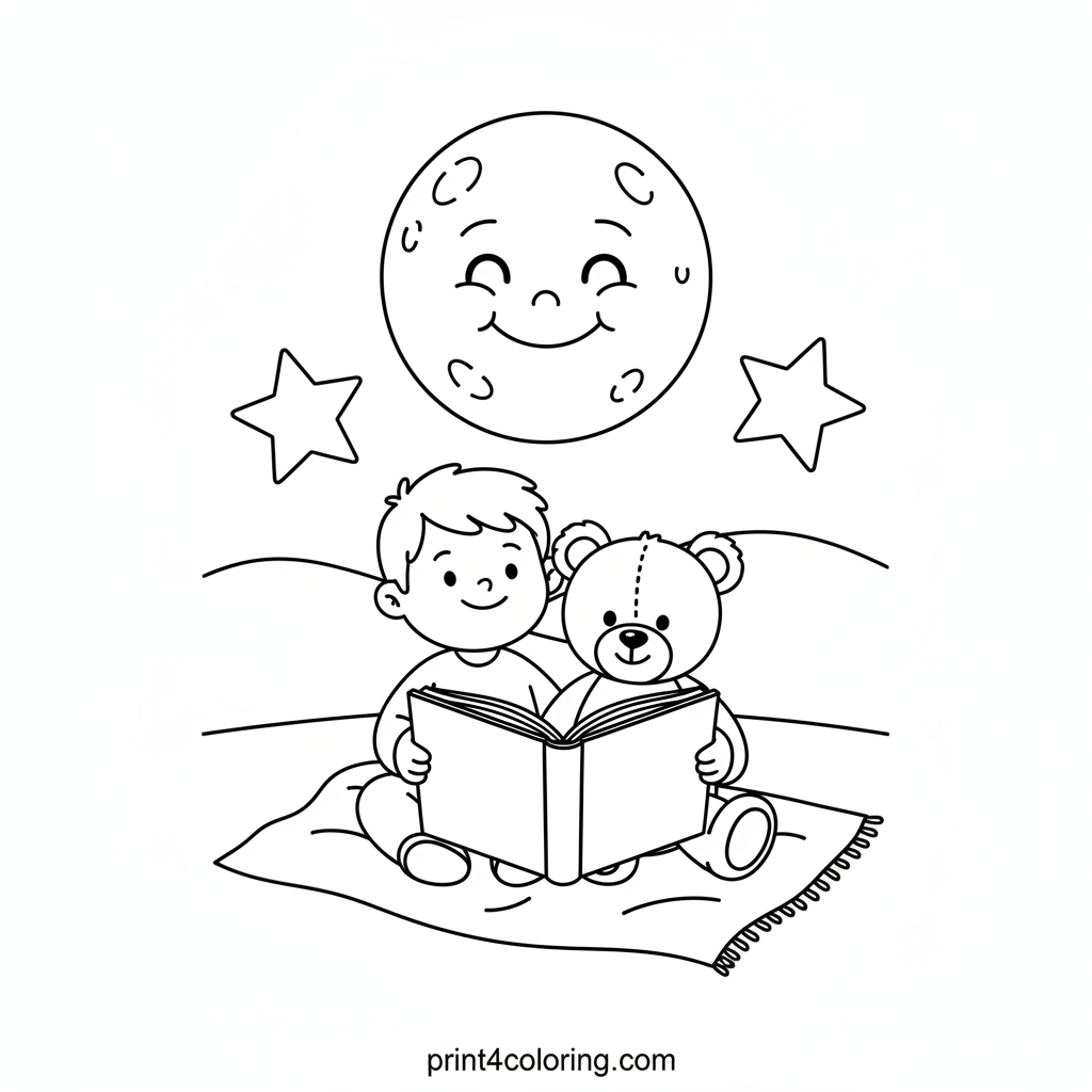 Snuggle up for a magical night! This cozy coloring page shows a happy child and their fluffy animal friend (maybe a bunny or teddy!) sharing a big storybook under the warm glow of a smiling full moon. Imagine the exciting tales they're reading in the peaceful night. A perfect scene for sweet dreams and creative coloring!