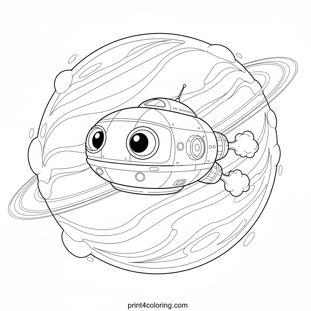 Embark on an interstellar adventure with a cute, cozy research vessel gracefully navigating Neptune's majestic, swirling blue and white cloud bands. Discover the dynamic atmosphere and faint, elegant rings of this distant ice giant, ready for your creative colors.