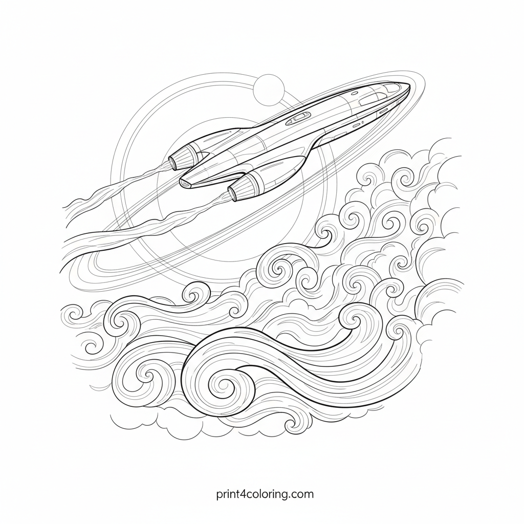 Embark on an epic space adventure! Color a sleek galactic explorer navigating the magnificent, swirling blue and white cloud bands of distant Neptune. Capture the planet's dynamic atmosphere and faint, elegant rings, bringing this cosmic scene to life. Perfect for aspiring astronauts!