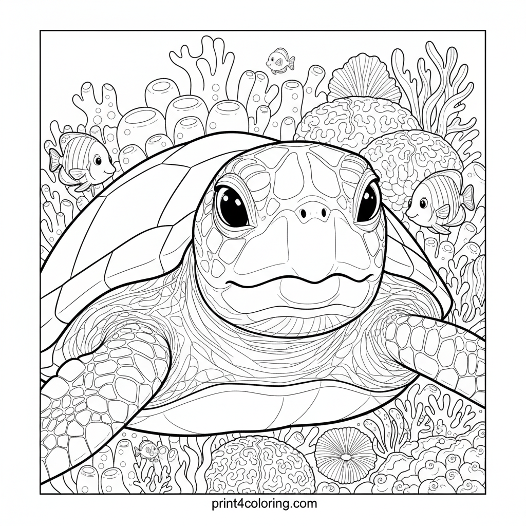 Dive into an expert-level coloring adventure with this intricate coral reef close-up! Discover detailed brain coral and fan coral textures, swaying anemones, and a vibrant school of tropical fish. A gentle sea turtle glides peacefully in the background, inviting you to bring this stunning underwater world to life with a burst of color.