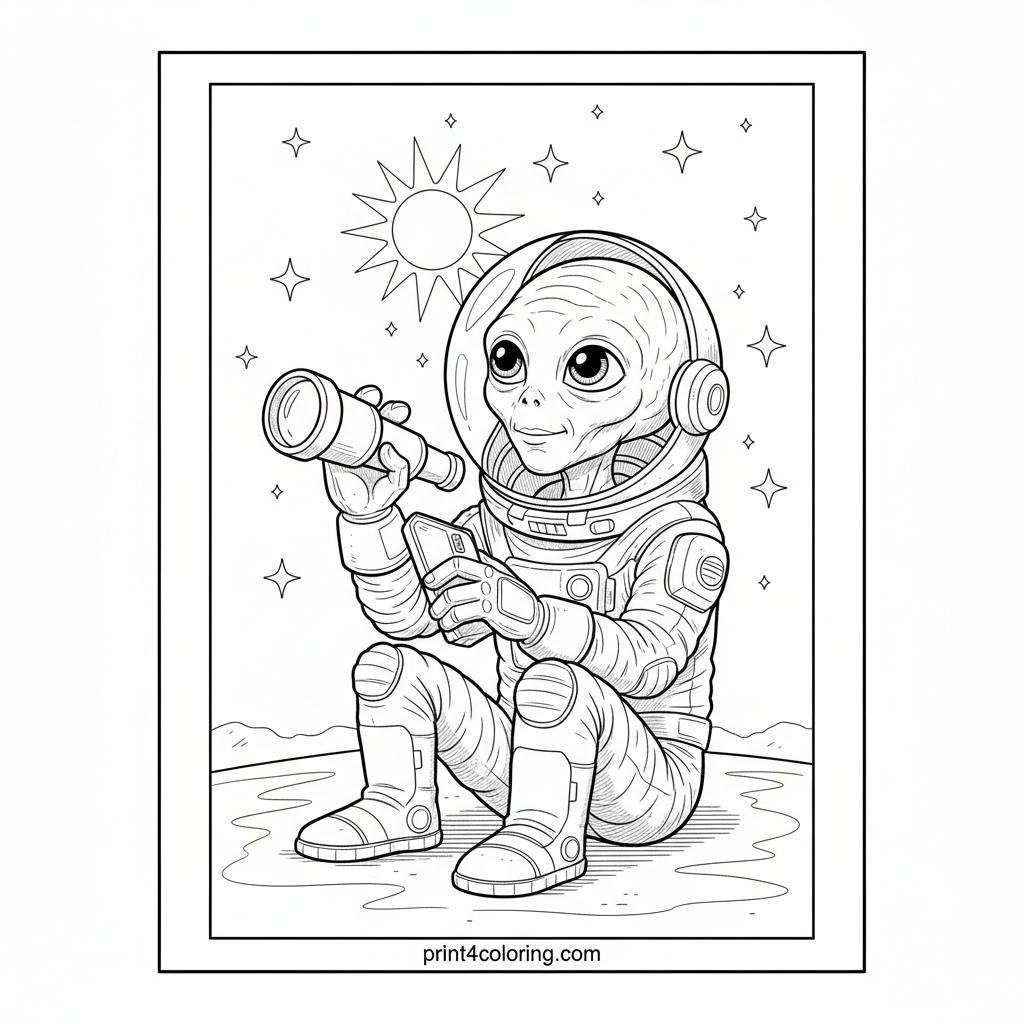 - 3✨ **Alien Space Suit Details** - Think about metallic silvers, deep blues, or even a futuristic iridescent sheen for the alien's meticulously designed space suit. Add subtle shadows to highlight its different panels and the handheld telescope.