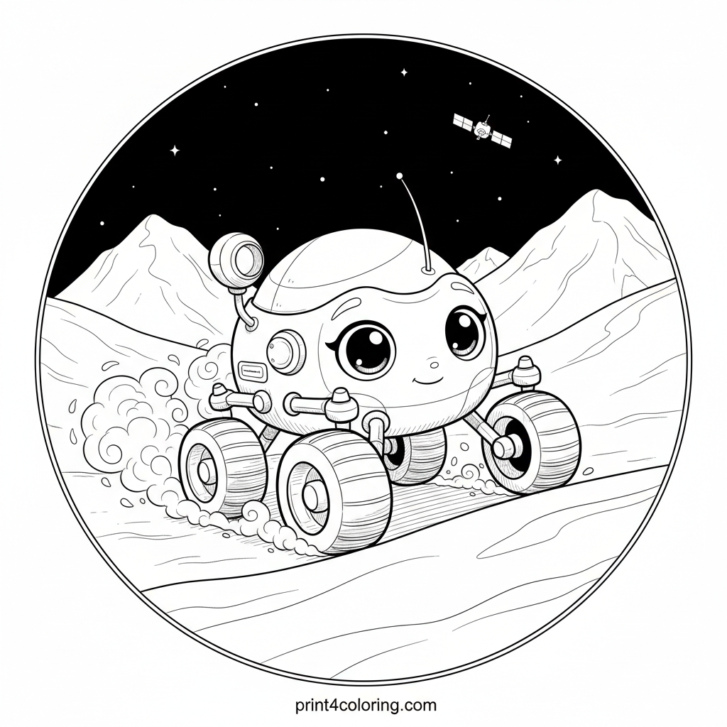 Join a brave, futuristic rover as it bravely climbs Pluto's majestic, icy peaks! Watch as its sturdy wheels kick up sparkling dust, with the tiny New Horizons spacecraft observing from the star-filled sky. A cosmic adventure awaits your colors!