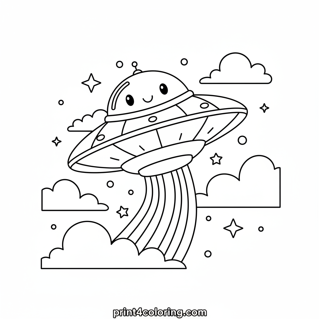 Embark on a cosmic journey with this enchanting coloring page! A friendly flying saucer glides through a dreamy night sky, sparkling with shimmering stardust. Its magical engine glows with all the colors of the rainbow, propelling it past soft, puffy clouds. Get ready to add your brightest colors to this whimsical adventure!