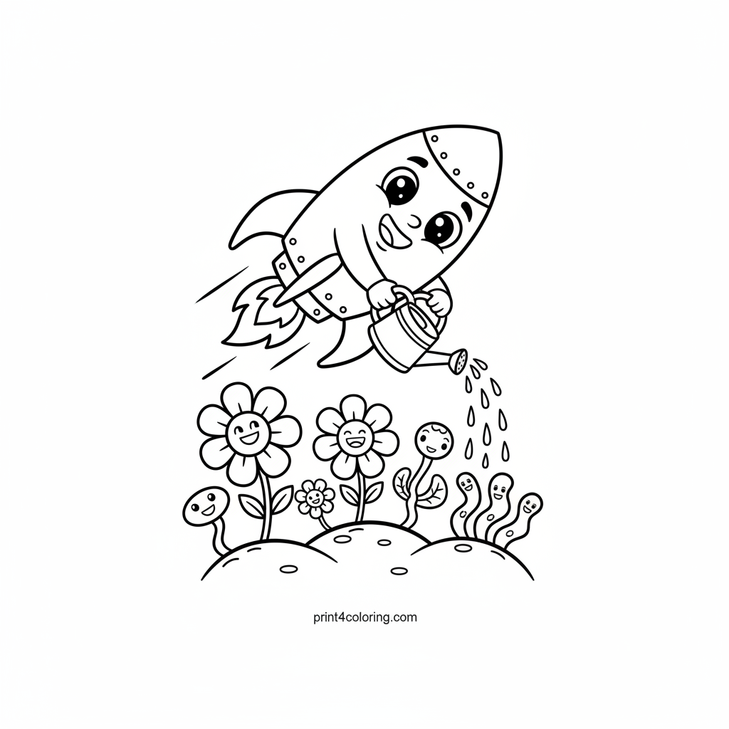 Join a cheerful rocket on an amazing adventure! Watch as it waters giant, smiling space flowers and wobbly alien plants on a vibrant, bumpy planet. This funny scene is bursting with cosmic joy and wacky flora, perfect for little artists to bring to life with their brightest colors.