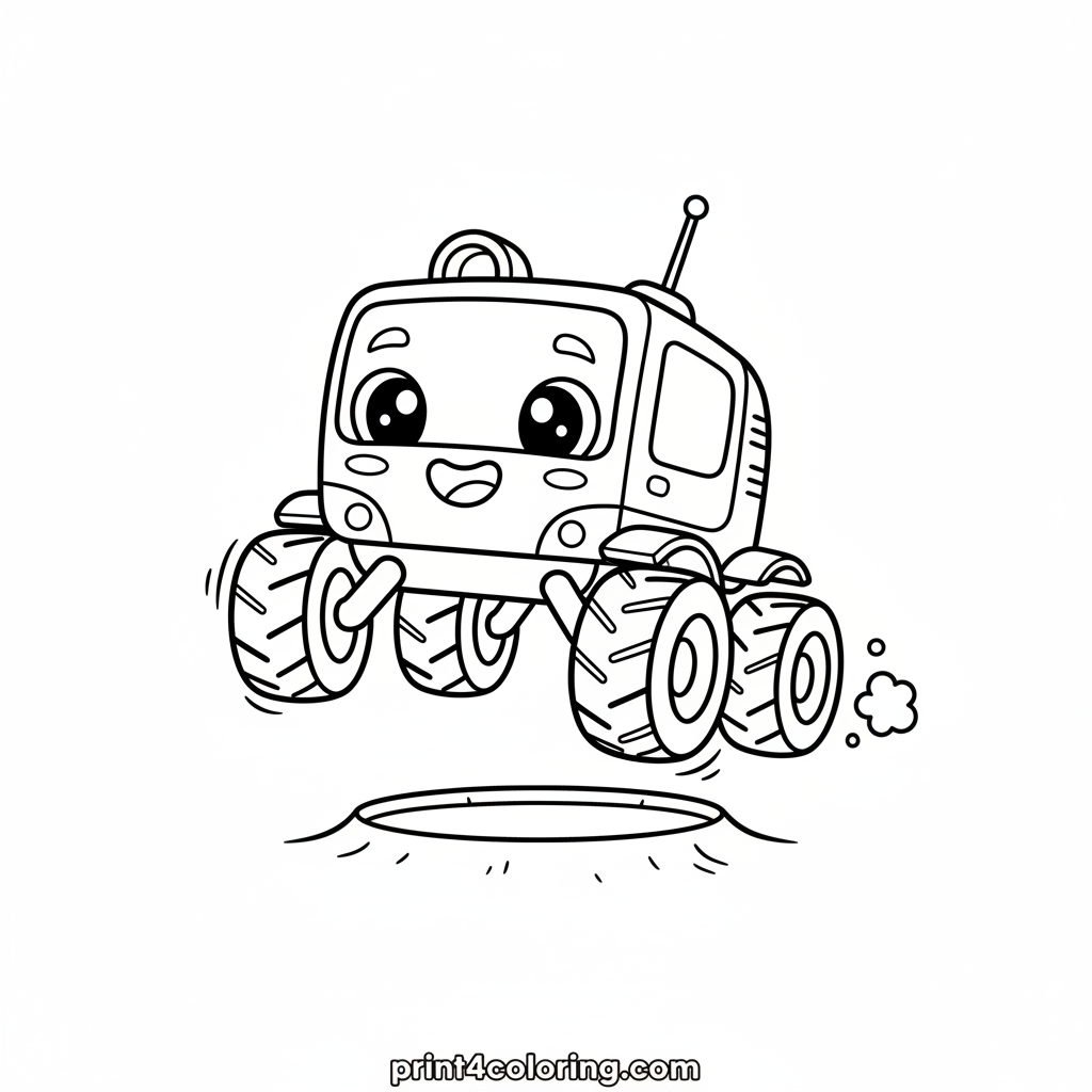 Join our friendly lunar rover on an exciting adventure! This sturdy space explorer is taking a gentle bounce over a small moon crater, its wheels slightly off the ground. A tiny puff of moon dust trails behind, showing its playful journey across the rocky lunar surface. Get ready to color this amazing scene!