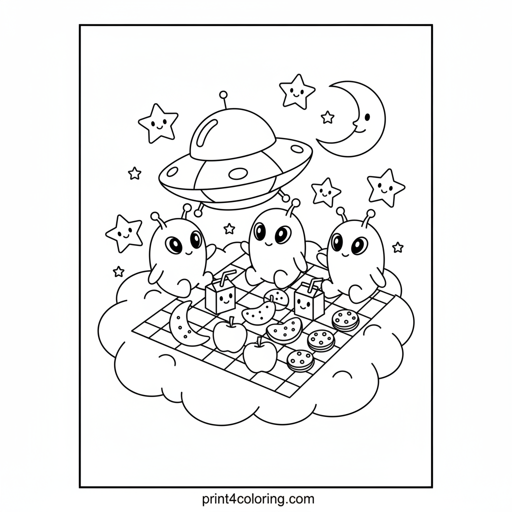 Zoom into outer space and join a friendly flying saucer and its adorable alien crew for the most out-of-this-world picnic ever! Perched on a fluffy cloud, these cute extraterrestrials are sharing colorful snacks and juice boxes. Grab your crayons and add vibrant hues to their happy cosmic feast!