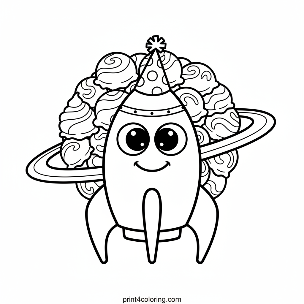 Join our goofy rocket, complete with googly eyes and a tiny party hat, on an incredible adventure! Watch as it zooms past a giant, swirly planet made entirely of delicious ice cream. This fun scene invites young artists to imagine a universe full of treats and exciting voyages. Get ready to color a cosmic feast!