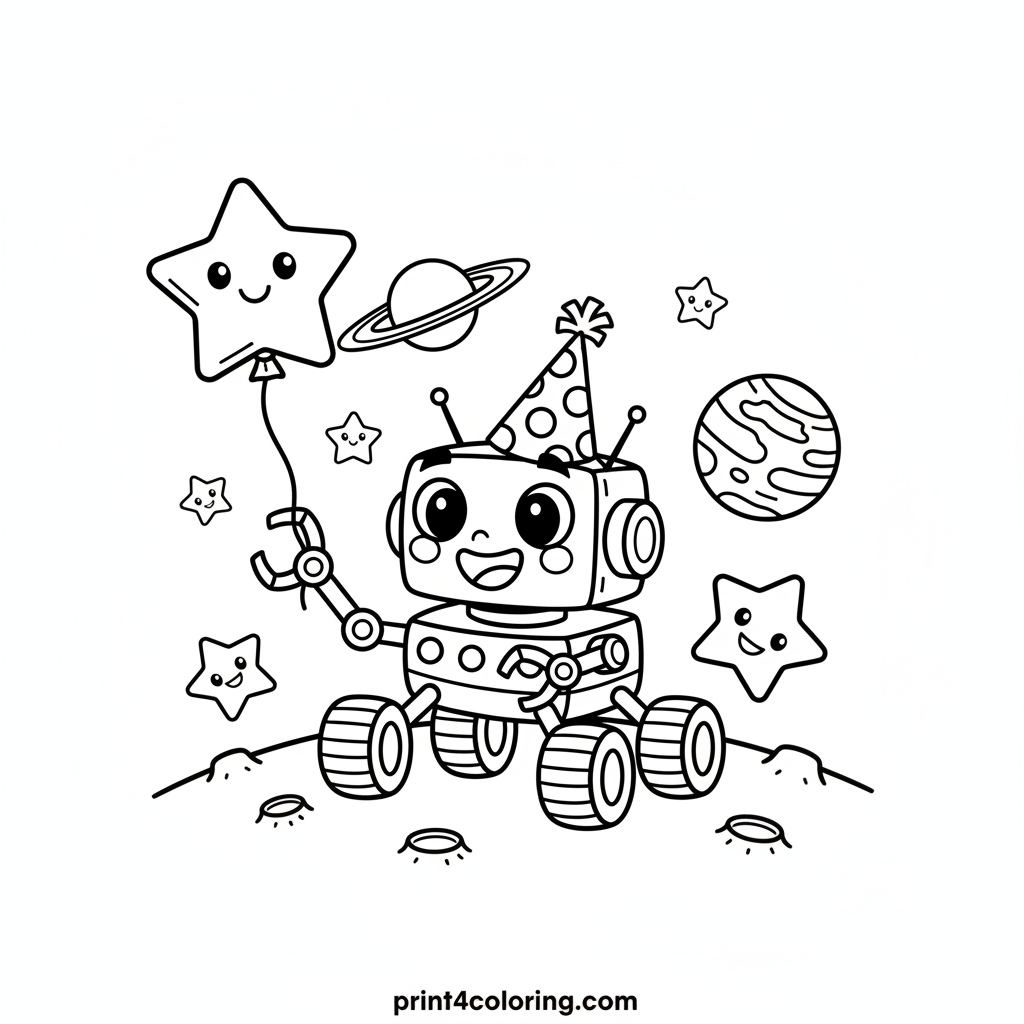 Join Silly Rover at its out-of-this-world space party! This cheerful lunar explorer, sporting a colorful party hat, is having a blast. Watch as it playfully reaches out with its robotic arm, trying to gently 'catch' a happy, star-shaped balloon floating in zero gravity. A fun scene perfect for young astronauts to color!