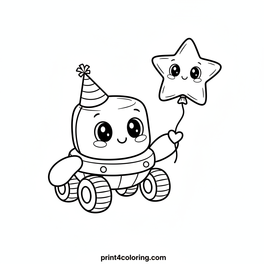 Join Silly Rover on a cosmic adventure! Our cheerful lunar friend, sporting a bright party hat, is having a blast on the moon. Watch as it playfully reaches out with its robotic arm to gently catch a happy, star-shaped balloon floating by. Get ready to color this adorable space celebration!