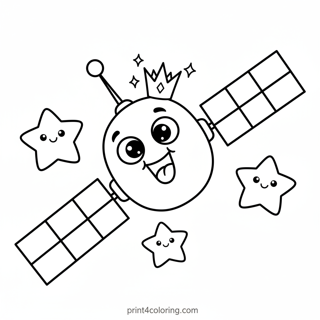 Blast off into a world of fun with this silly satellite! Our goofy space friend is sporting a tiny, sparkly crown on its antenna, looking surprised as it floats among happy-faced stars. Grab your crayons and bring this royal space adventurer to life with your favorite colors!