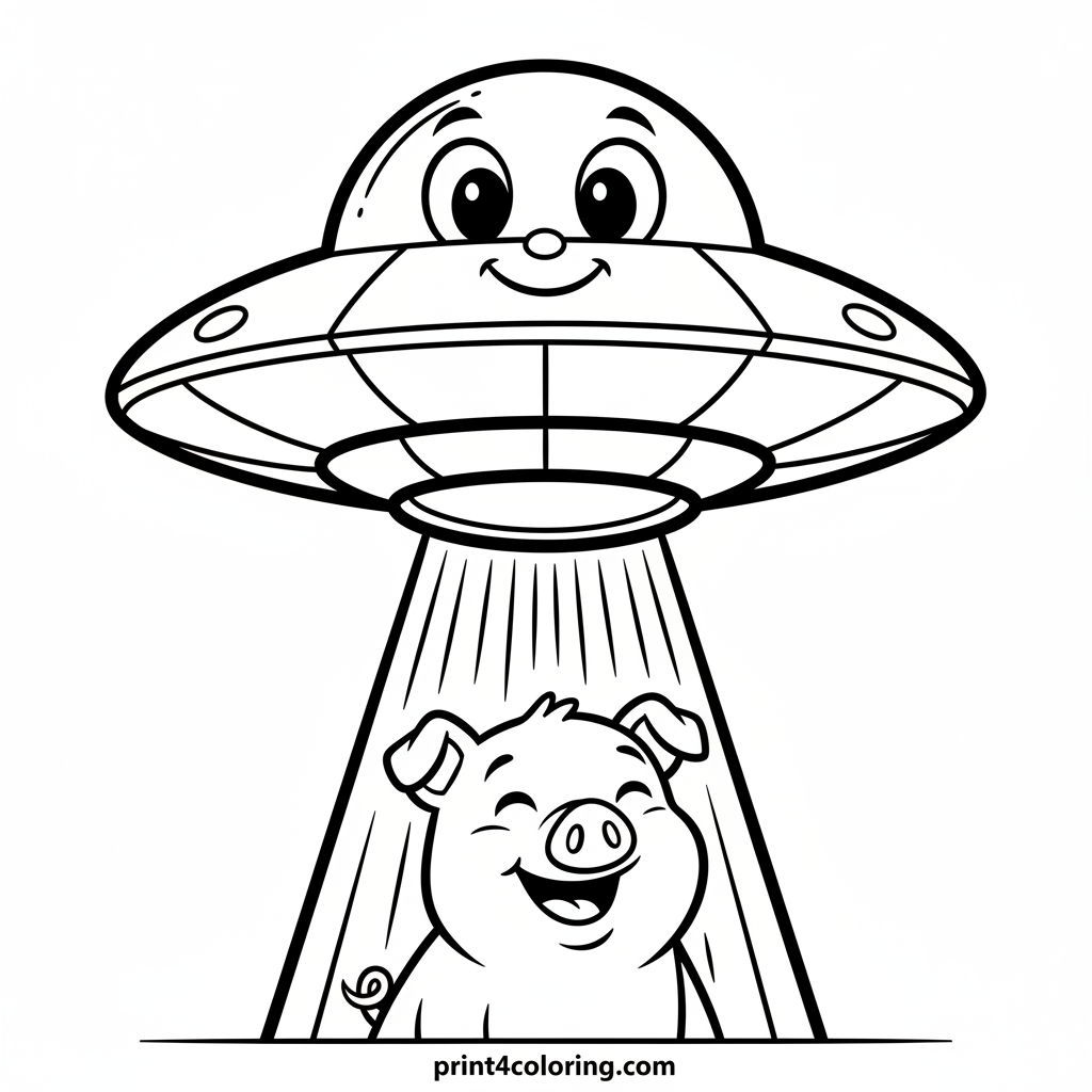 Join a funny, smiling flying saucer on a silly rescue mission! Watch as it uses a gentle, glowing beam to carefully lift a happy, giggling farm animal, like a cute little pig or a fluffy sheep, into its cozy interior. What amazing colors will you use for this out-of-this-world adventure?