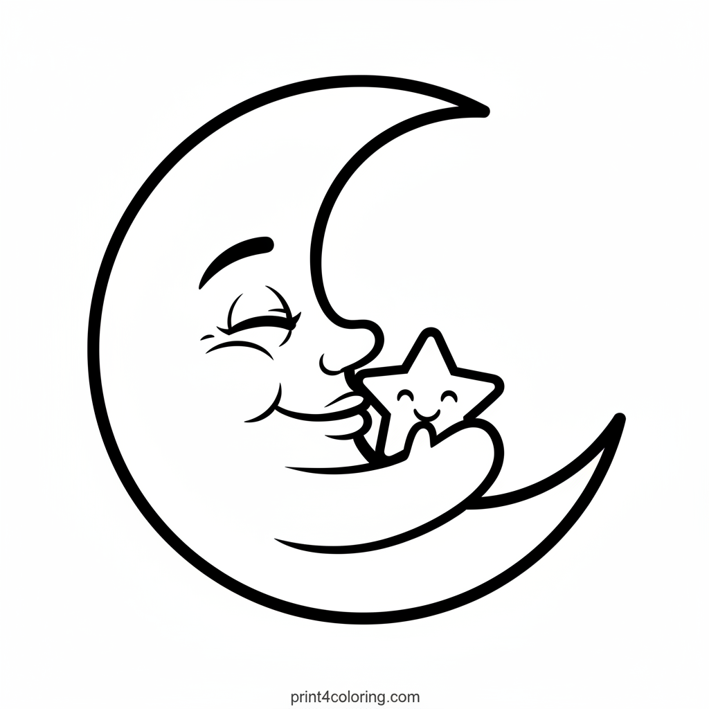 Drift into a world of dreams with this adorable coloring page! A super cute crescent moon, with soft, round features and peaceful, closed eyes, gently cuddles a tiny, smiling star. Imagine warm, cozy colors to bring this sleepy celestial duo to life. Perfect for a peaceful coloring adventure!