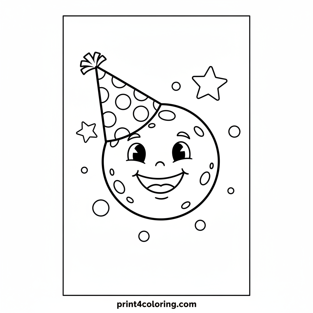 Get ready for a cosmic giggle! This coloring page features a cheerful full moon with a big, friendly grin, sporting a super silly, oversized party hat tilted just so. Simple confetti floats around, making it a super easy and fun scene for little hands to color and bring to life with bright, happy colors.