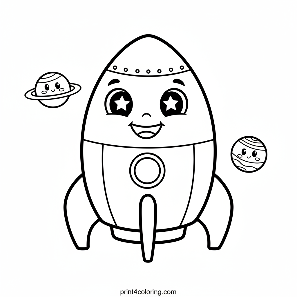 Blast off with our adorable little rocket! This cheerful, round spaceship has a big smile and starry eyes, gently floating through space. It's surrounded by friendly, happy-faced planets, all ready for you to bring them to life with your favorite colors. A perfect scene for young astronauts and artists!