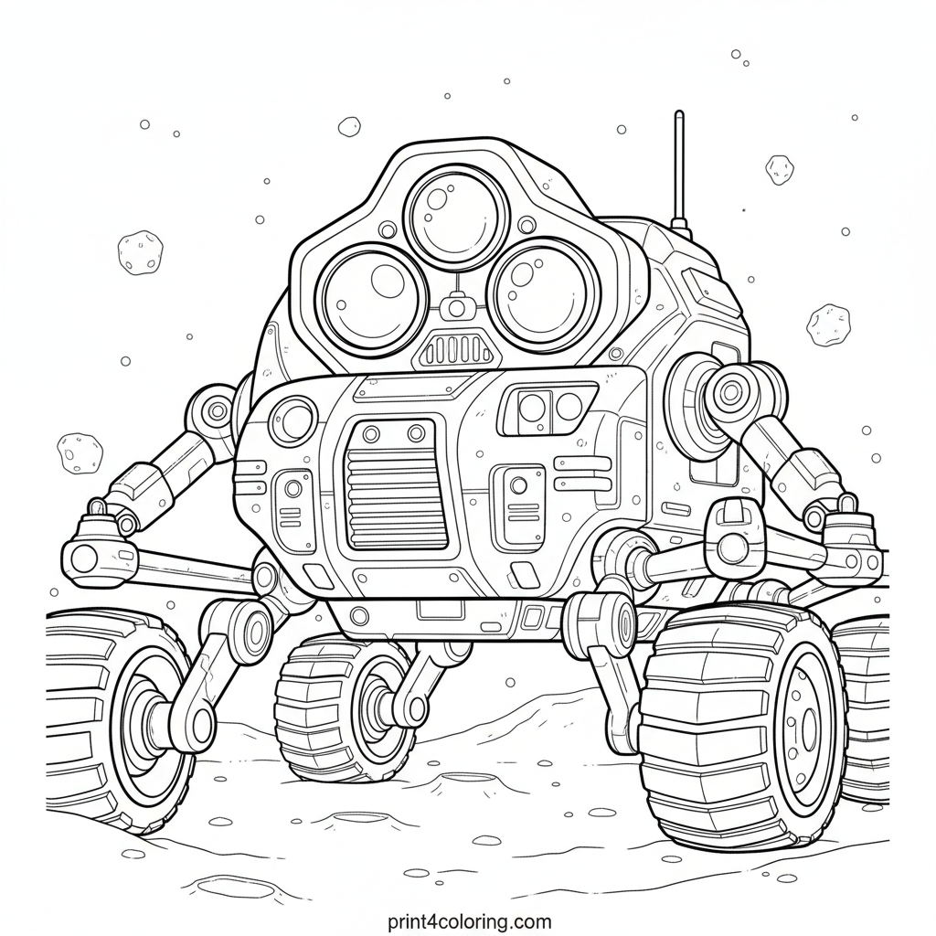 Blast off into an expert-level coloring adventure! This detailed page showcases a friendly space rover gently exploring the rugged, cratered surface of a distant asteroid. With intricate scientific instruments, articulated wheels, and a cosmic background of twinkling stars, bring this interstellar expedition to life with your brightest colors.