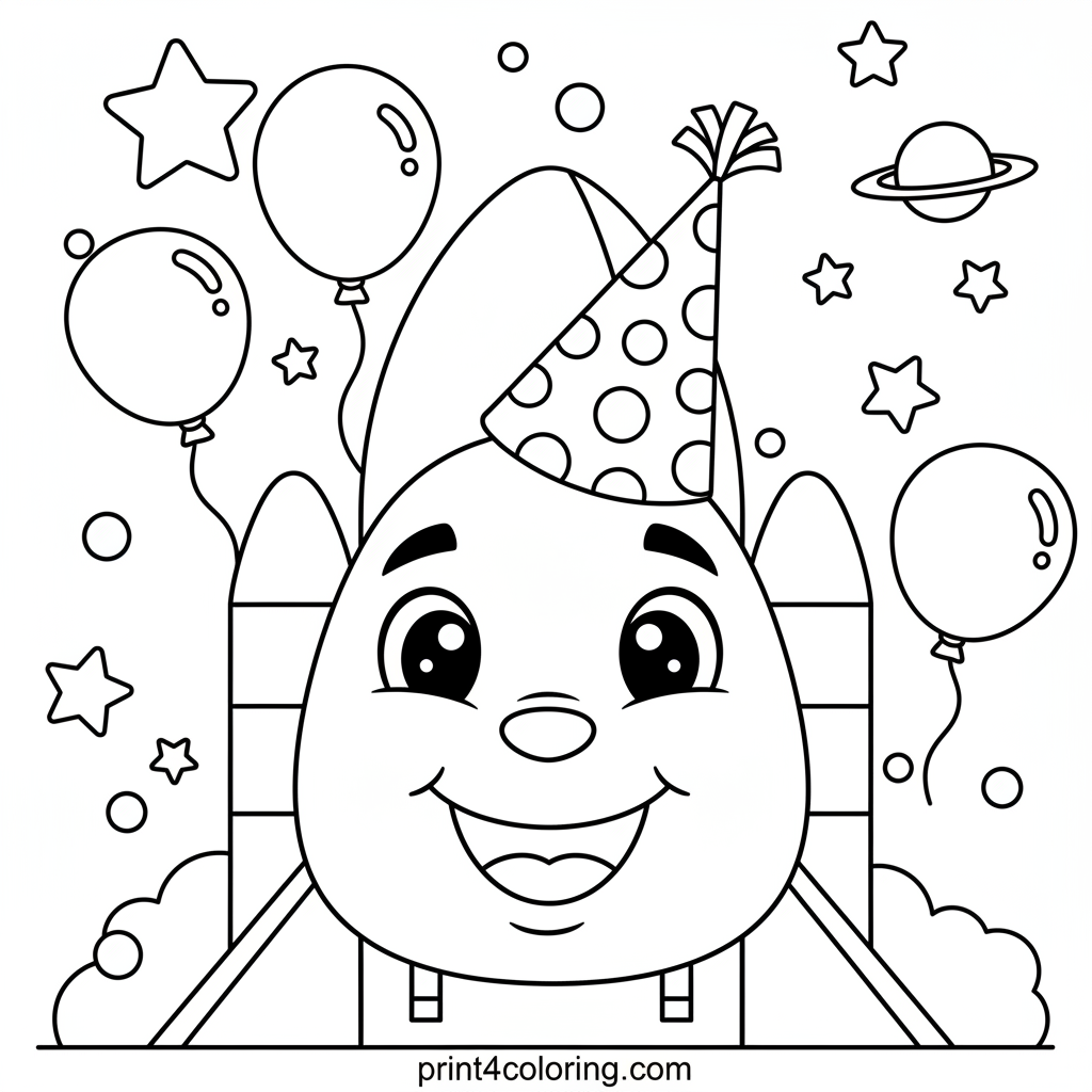 Blast off into a world of color with our happy space shuttle! This friendly rocket is ready to party, sporting a tall, polka-dotted hat. Imagine confetti falling and balloons floating all around in a super silly, whimsical outer space celebration. Get ready to add vibrant colors to this cosmic bash!