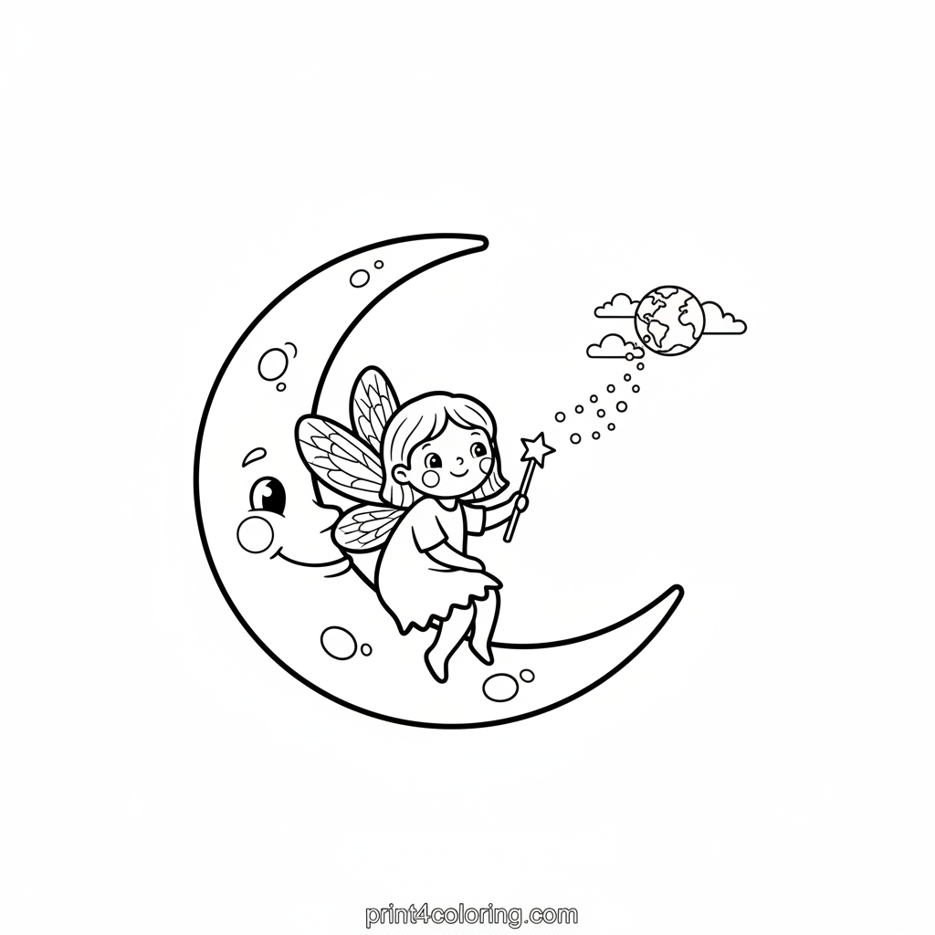 Imagine a magical night where a tiny, kind moon fairy sits softly on a crescent moon. With her shimmering wings, she gently waves a magical wand, sending sparkling wish dust down towards our distant Earth. What wonderful wishes will come true tonight? Grab your colors and bring this enchanting scene to life!
