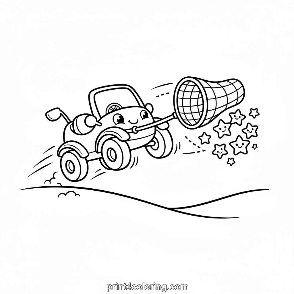 Join a magical moon buggy on its cosmic quest! Watch as this whimsical vehicle gently scoops tiny, smiling stars from the lunar dust with its net. The buggy glows softly with magic, illuminating the enchanting night. Grab your colors and bring this starry adventure to life!