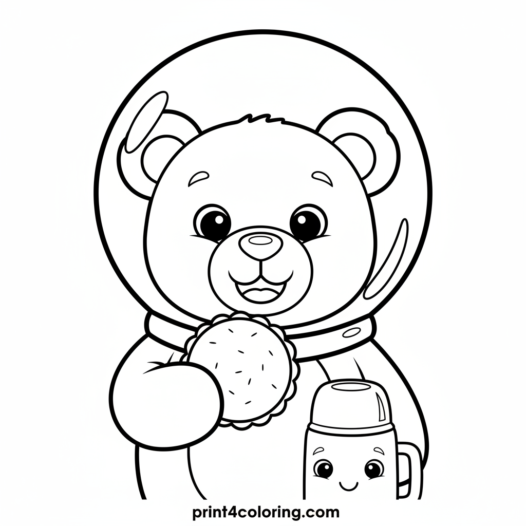 Blast off to an amazing lunar picnic! This coloring page features a friendly moon buggy parked next to a cozy blanket on the moon. A brave teddy bear, wearing a cool space helmet, enjoys a yummy 'moon-pie' from a thermos. Get ready to color this out-of-this-world adventure and make the moon glow!