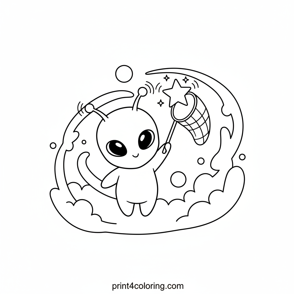 Embark on a magical space adventure with our gentle alien friend! This friendly creature, with soft features and glowing antennae, carefully catches a twinkling star in a small net. Swirling colorful cosmic dust surrounds them. Imagine the vibrant colors you'll use to bring this easy and fun starry scene to life!