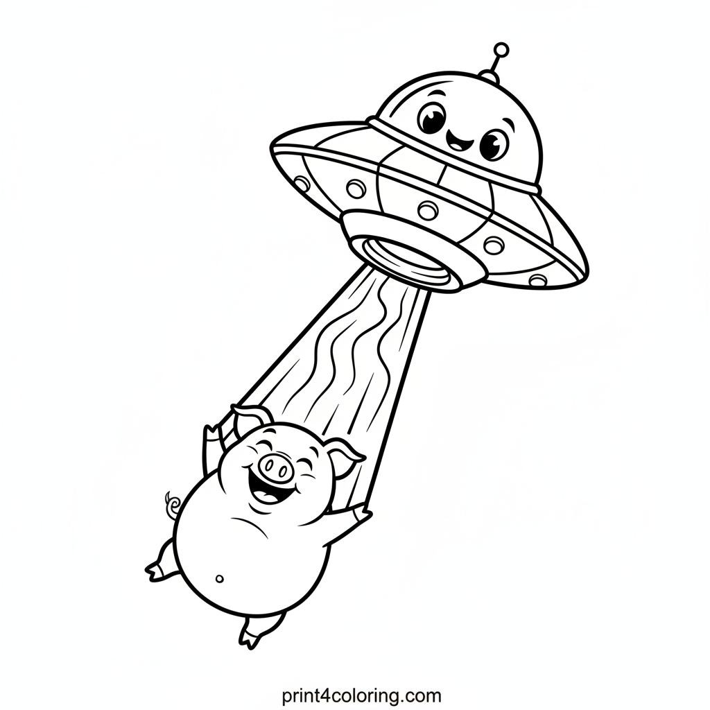Get ready for a silly adventure! A friendly, smiling flying saucer is on a special mission, using its gentle glowing beam to carefully lift a happy, giggling farm animal, like a cheerful pig or a fluffy sheep, into its cozy spaceship. Color this funny, out-of-this-world rescue scene!