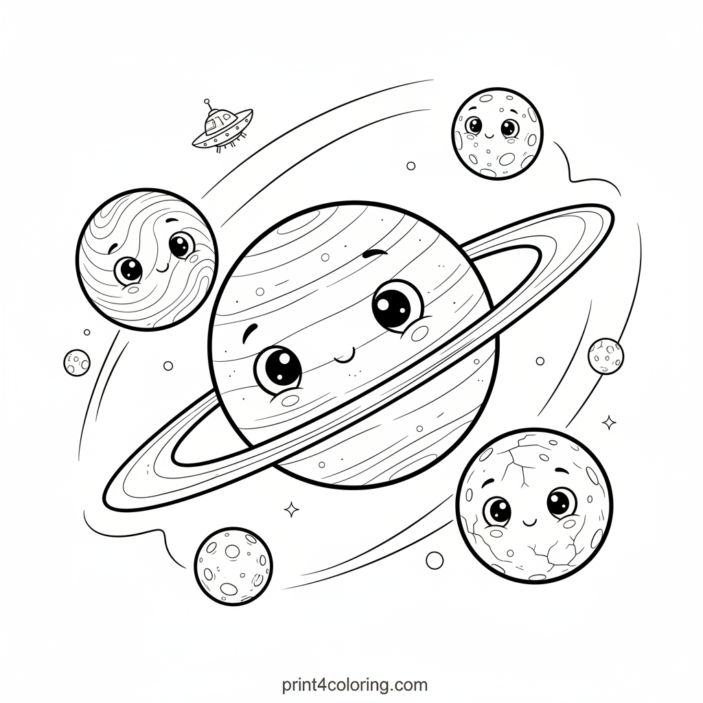Embark on a celestial journey to color Uranus and its enchanting moon family! Witness the ice giant's famous tilt as its largest moons, Titania, Oberon, and Ariel, perform a graceful cosmic ballet. Each moon boasts unique, detailed surfaces, while a friendly research vessel observes this wondrous, detailed scene from afar. A truly grand spectacle to bring to life!