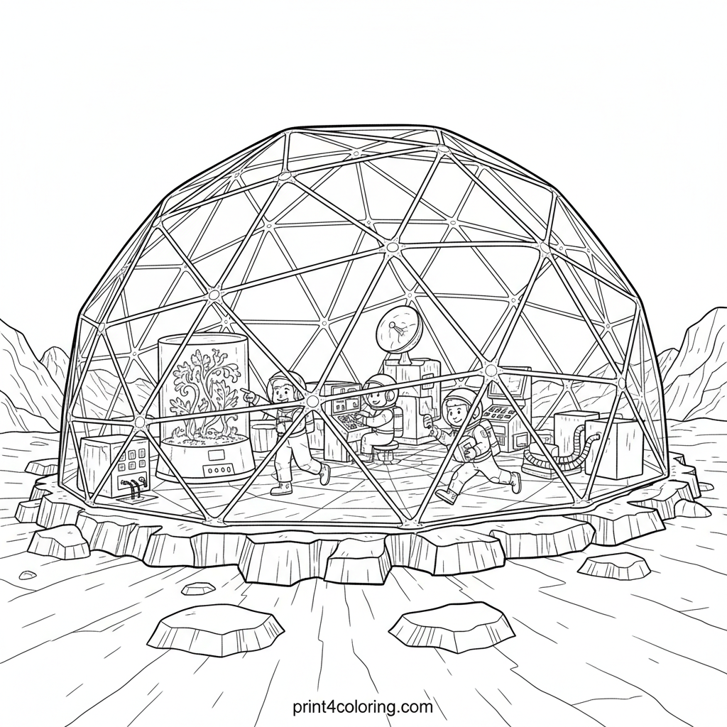 Explore an intricate geodesic research dome on the rocky, orange landscape of Venus. Inside, friendly scientists observe instruments and nurture a tiny plant experiment. This detailed scene invites you to imagine peaceful scientific discovery on another planet, highlighting the dome's fascinating structure and interior activity.