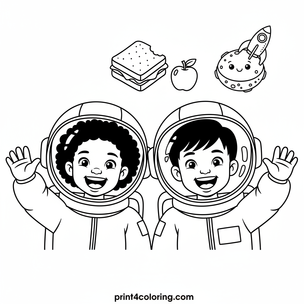 #astronauts#space#picnic#kids#rocket#asteroid#outer-space#fantasy#waving#coloring-page#printable