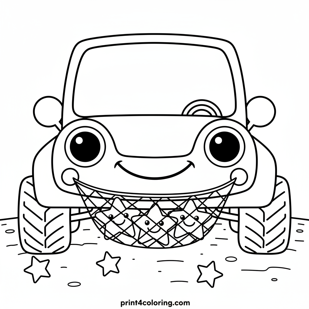 Imagine a magical moon buggy on an important mission! This whimsical vehicle, glowing softly, uses its special net to gently scoop up tiny, smiling stars scattered across the lunar dust. Itβs a close-up adventure, inviting you to add vibrant colors to its cosmic journey and the glowing starlight it collects.