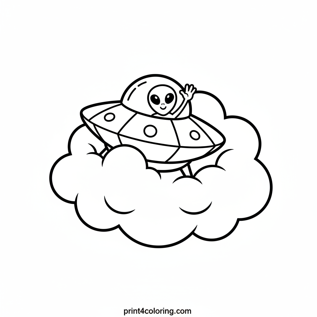 Get ready for an out-of-this-world coloring adventure! A super cute, wobbly UFO is having a little trouble landing and has gotten stuck in a soft, fluffy cloud. Look closely, a friendly alien is waving hello from the window! Use your imagination to bring this funny, cosmic scene to life.