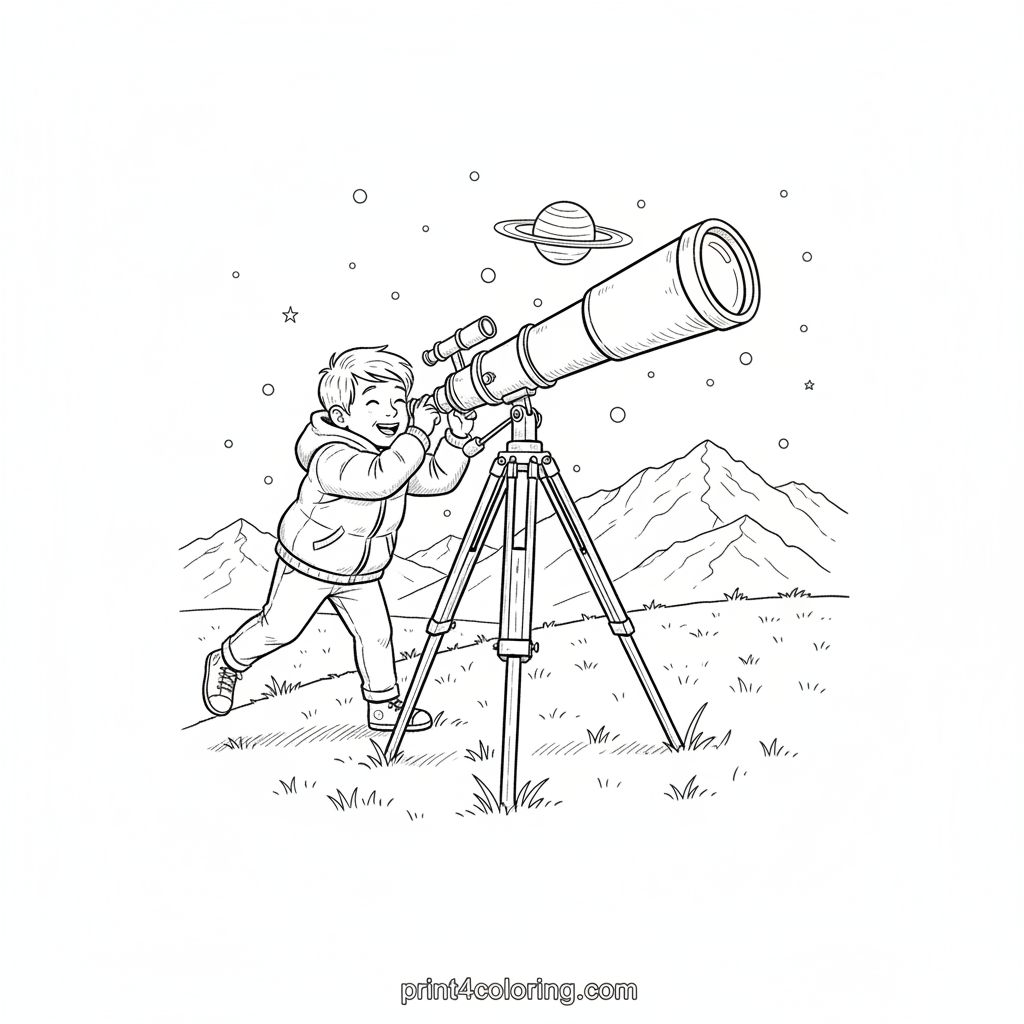 Join a curious young astronomer on a thrilling night adventure! Peering through a classic telescope from a grassy hill, they've spotted something amazing in the starry sky. With distant mountains silhouetted and a visible planet shining brightly, this detailed scene invites you to color the wonders of the universe. What colors will you use for this cosmic discovery?