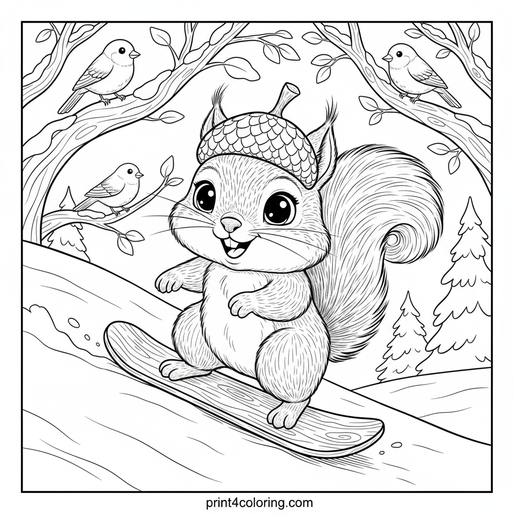A Squirrel's Epic Acorn Snowboard Ride Coloring Page